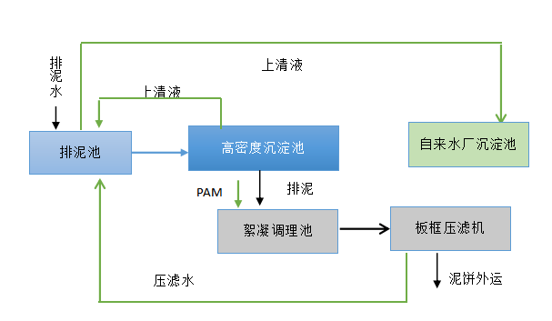 濮阳市自来水公司第一自来水厂,日处理量为12万m3/d,肩负着濮阳市市区居民生活用水和濮阳市高新技术开发区工业用水的重任。净水处理中产生污泥的来源主要是自来水厂沉淀池的排泥及滤池的反冲洗排水,污泥的成分以泥砂颗粒和絮凝剂的水解产物为主。原来设计排泥水不经处理直接排放至濮水河,增加了濮水河河床淤积程度和增加水体的浑浊度,严重影响濮水河作为景观河流的水质,并造成水资源的浪费。2018年濮阳市自来水公司从环保和节约水资源的角度考虑,决定建设排泥水处理工程。